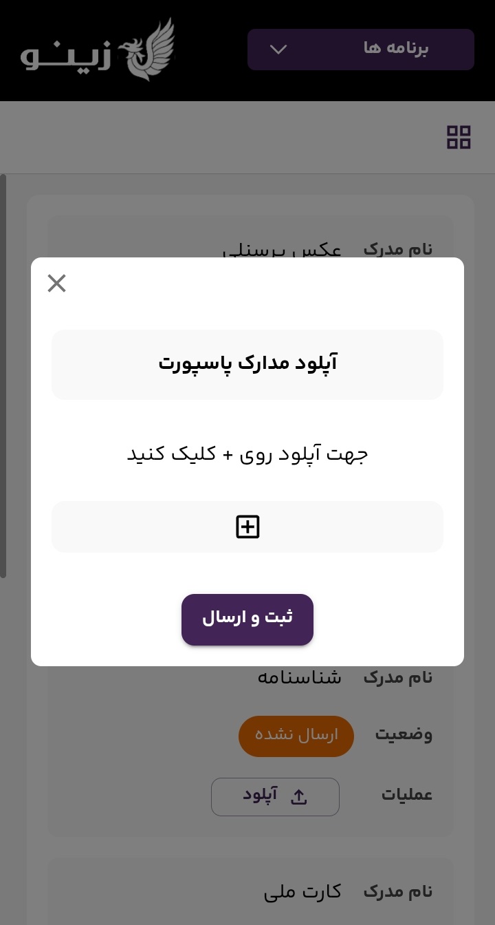 3- برای هر یک از مدارک، روی دکمه آپلود مدارک کلیک کنید، در کادر باز شده روی علامت "+" کلیک کنید و مدرک موردنظر را انتخاب و آپلود کنید. پس از آن روی دکمه "ثبت و ارسال" کلیک کنید.