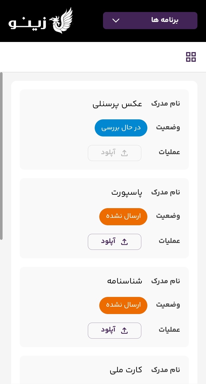پس از اینکه پیامک درخواست آپلود مدارک برای شما ارسال شد، باید مطابق با فرآیند زیر مدارک خود را در نرم افزار آپلود کنید.