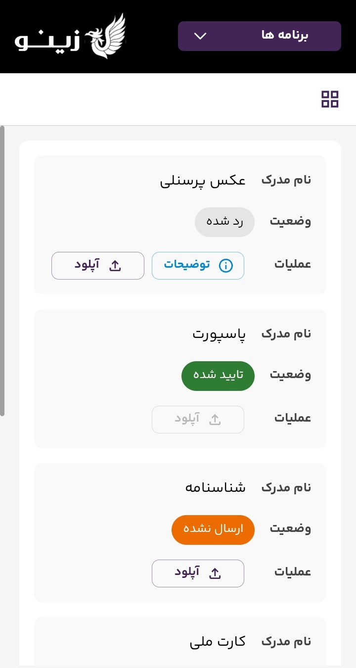 همچنین در بخش مدیریت مدارک می توانید مدارک خود را آپلود نمایید و فرآیند رد یا تایید مدارک را دنبال کنید.