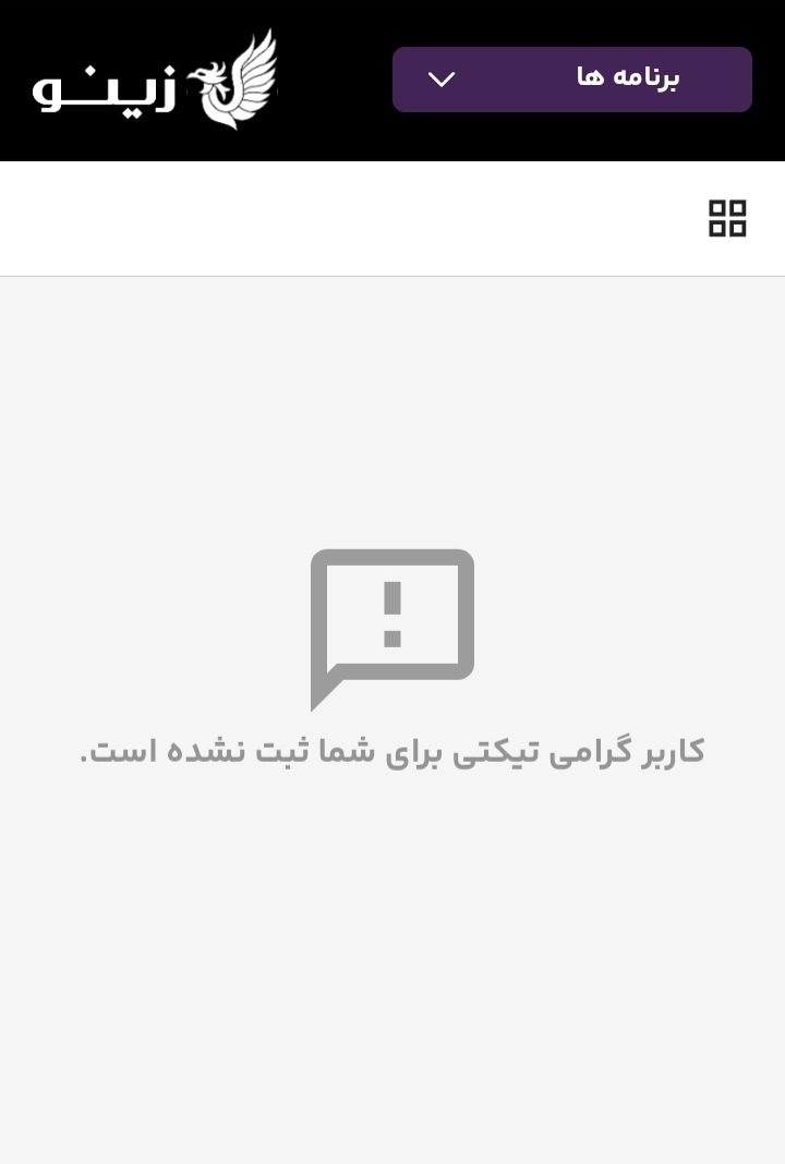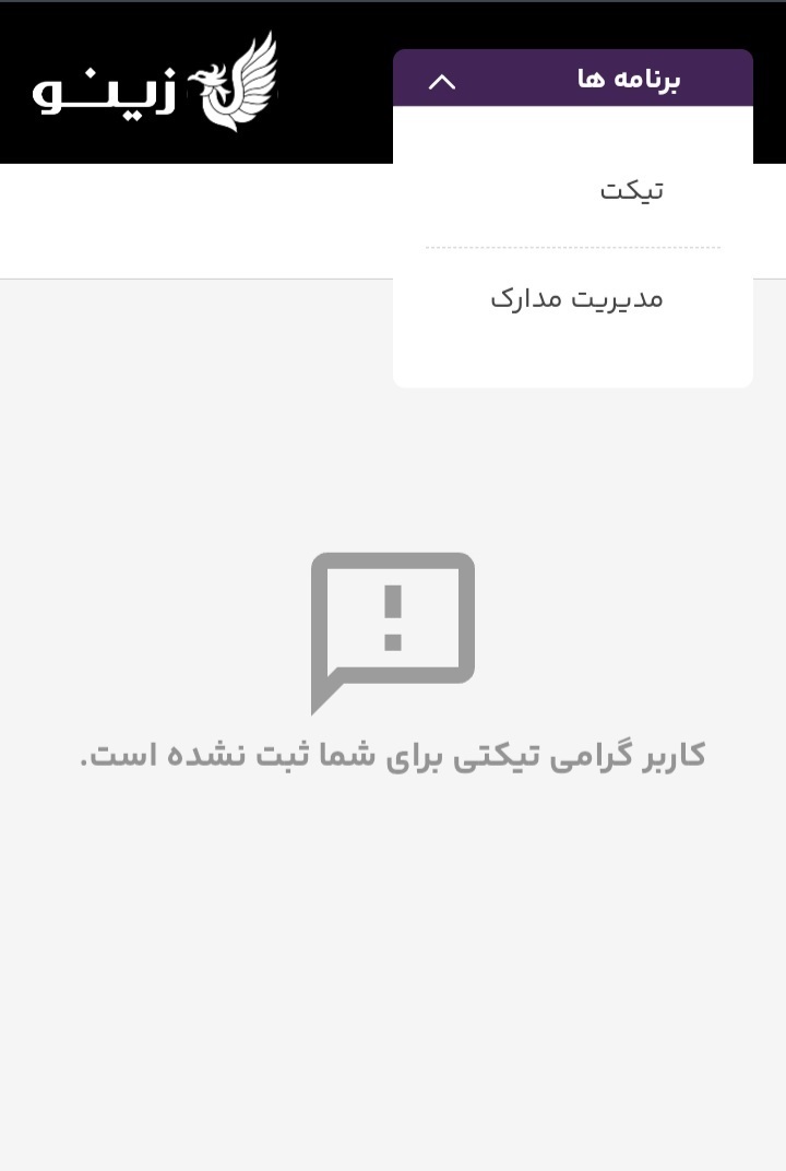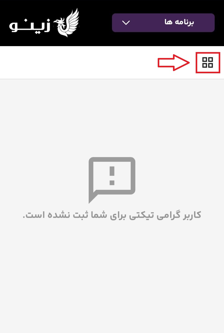 1- از منوی بالای سایت روی دکمه "برنامه ها" کلیک کنید و سپس "تیکت" را انتخاب کنید.